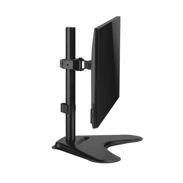 Stalak je izrađen od kvalitetnog čelika i plastike s crnim praškasto lakiranim premazom, što osigurava dugotrajnost i otpornost na ogrebotine. Ergonomski dizajn omogućuje optimalan kut gledanja i sigurnu montažu monitora, dok integrirani sustav za upravljanje kablovima pomaže održati uredan prostor.