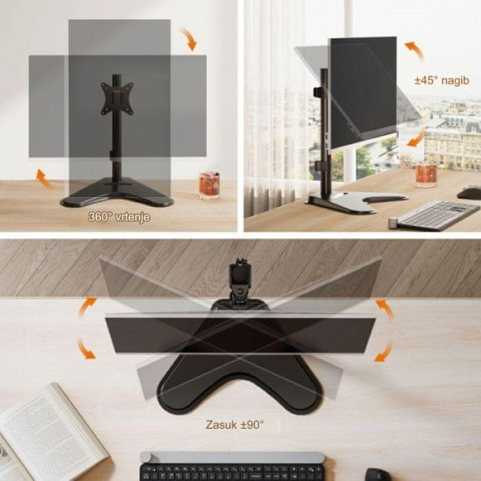 Opremljen s ±45° nagibom, ±180° rotacijom i ±180° podešavanjem razine, omogućuje vam brzo prilagođavanje vašeg monitora prema vašim individualnim potrebama (bez potrebnog alata). Samostojeća konstrukcija omogućuje izvrsnu manevriranje.