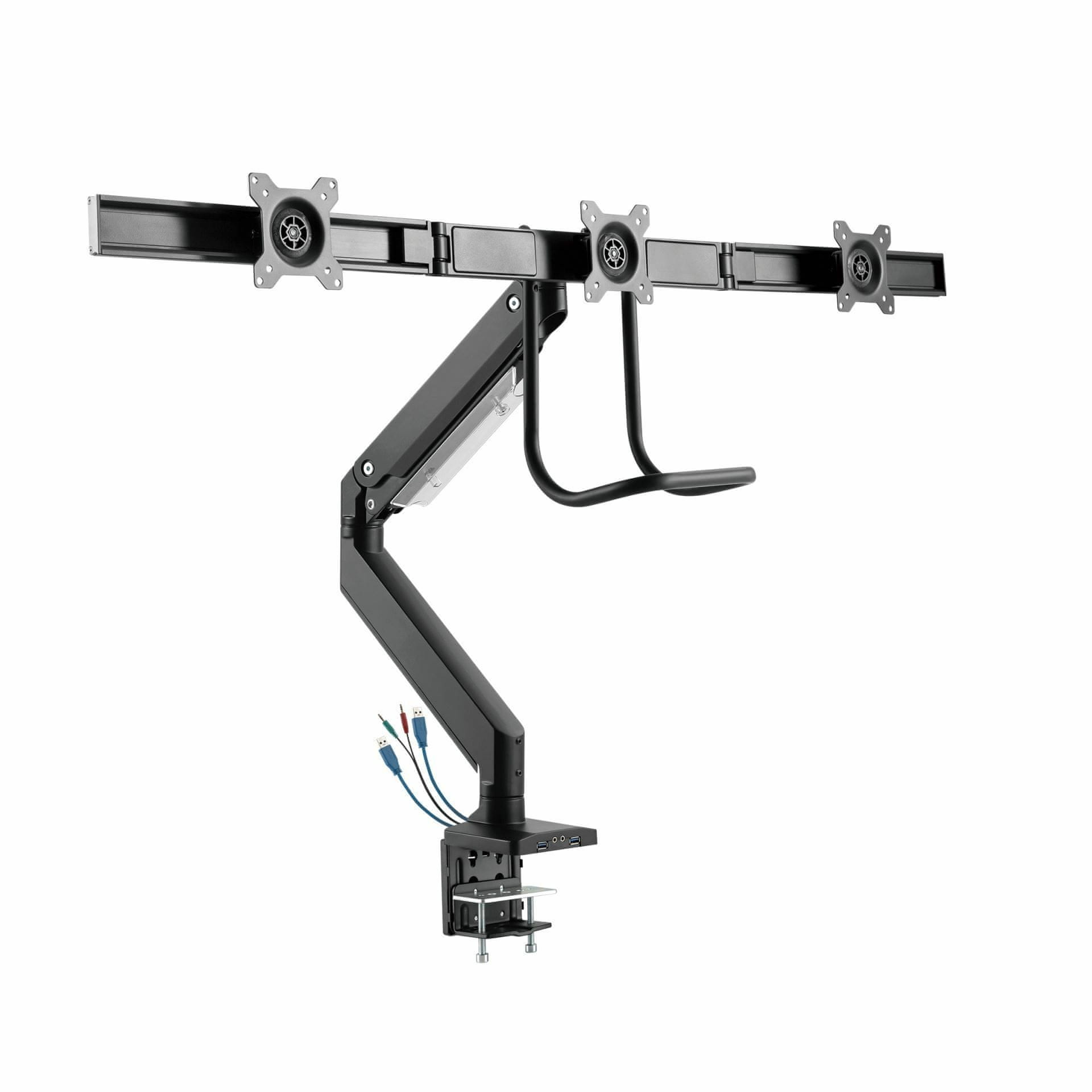 White Shark RHAMSES III je stolni nosač s plinskom oprugom na koji možete postaviti tri monitora. Svaki monitor je moguće neovisno okretati. Pomoću USB i multimedijskih priključaka možete i dalje koristiti svaki zaslon za prijenos podataka, punjenje itd.