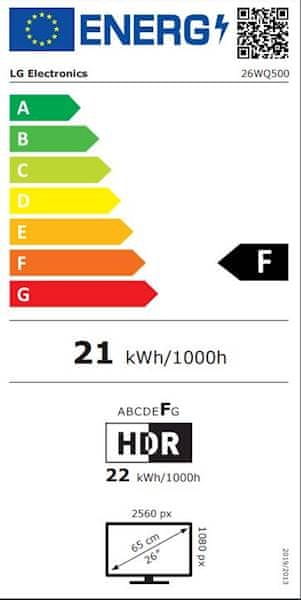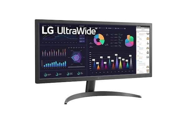 LG monitor 26WQ500-B ima dijagonalu 60,7 cm (26"), IPS tehnologiju panela, rezoluciju UWFHD (2560 × 1080), odziv 5 ms, kontrast 1000 : 1, svjetlina 250 cd/m², omjer slike 21:9, brzina osvježavanja 75 Hz. Sučelja: 2 x HDMI, izlaz za slušalice. Tehnologija: HDR10, HDR Effect, Power Consumption (Energy Star) 15,09W.