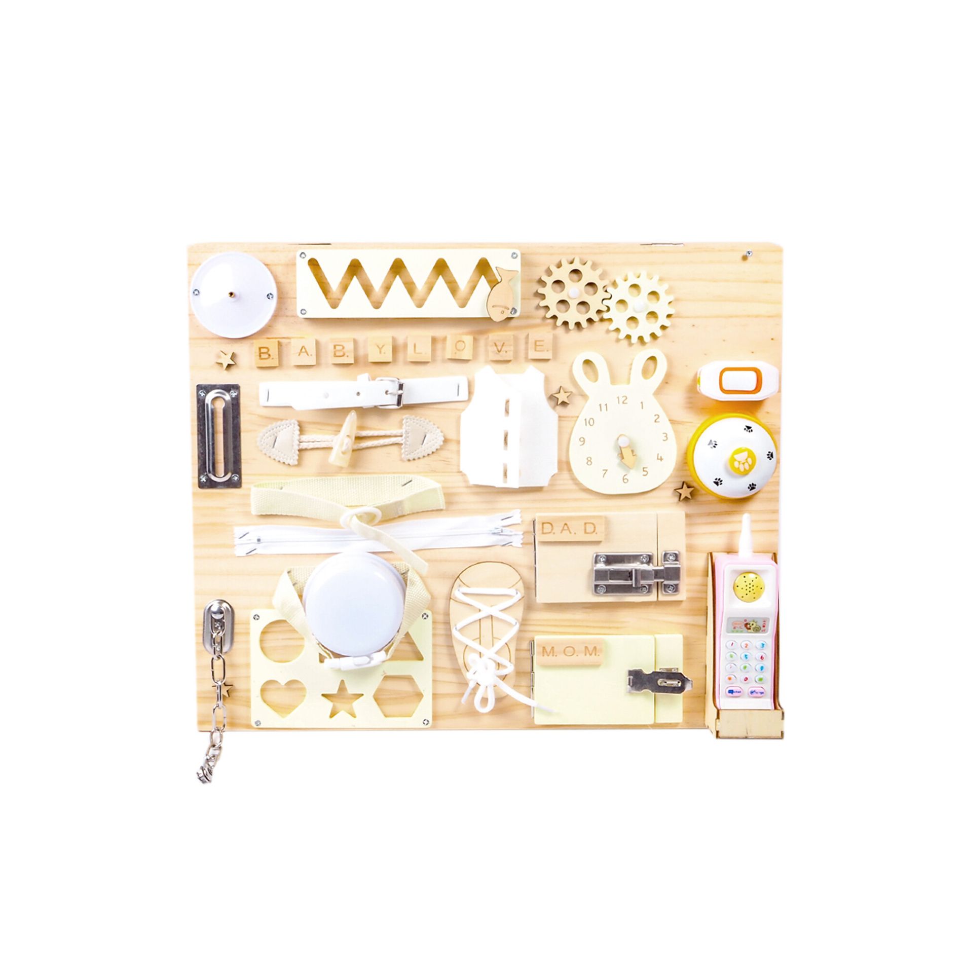 S jedne strane ploče male ruke otkrivaju poticaje za poticanje logičkog razmišljanja.Vezice za cipele su pristupačan način za učenje vezivanja, klasični patentni zatvarač potiče kreativnost. Malen će također cijeniti kotačiće, zvono, kazaljke na satu, mobitel, oblike i mnogo toga drugog.