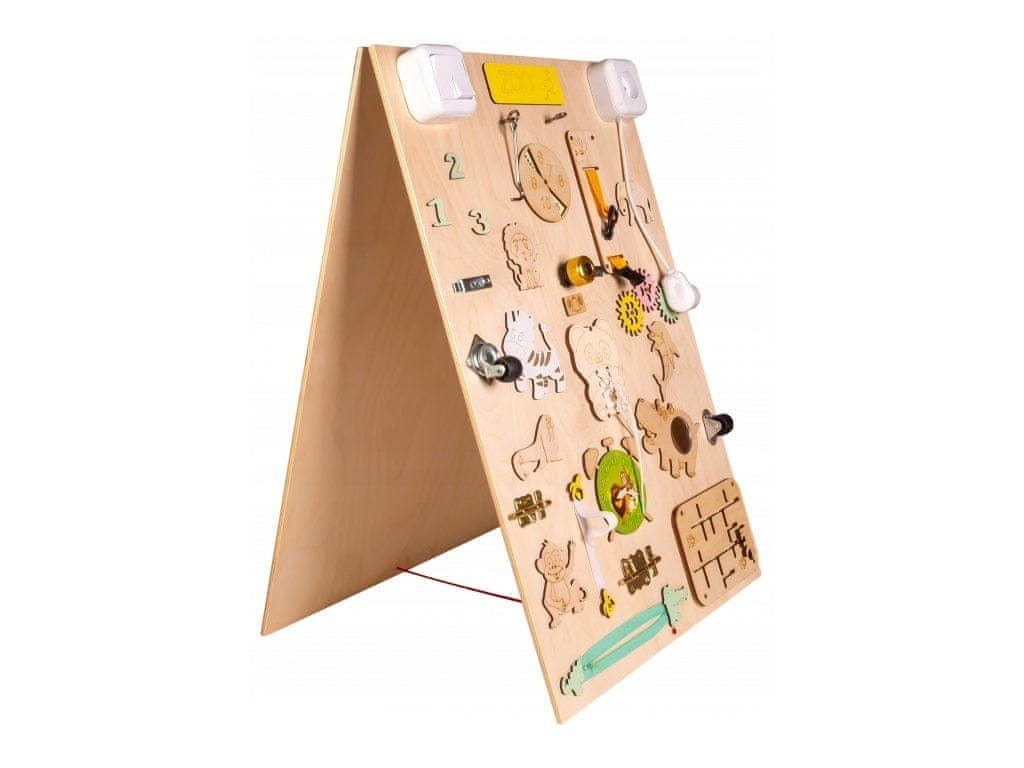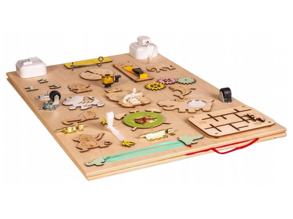 S jedne strane ploče male ruke otkrivaju poticaje za poticanje logičkog razmišljanja.Vezice za cipele su pristupačan način za učenje vezivanja, klasični patentni zatvarač potiče kreativnost.