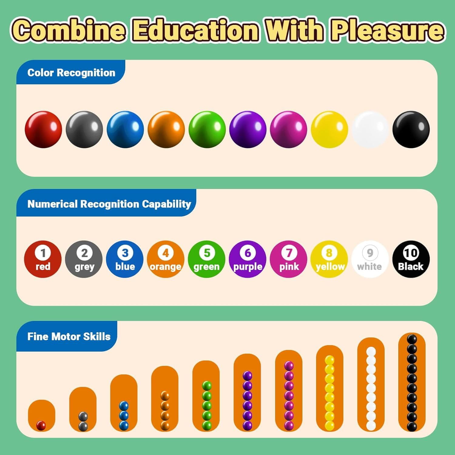 - Logičko razmišljanje: učenje matematike i logike omogućeno je zahvaljujući sustavu razvrstavanja kuglica prema bojama i dodijeljenim brojevima.