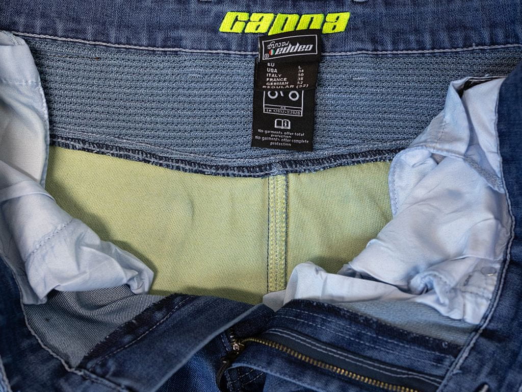 Zaštita vozača osigurana je unutarnjim gumenim štitnicima i ojačanjem od aramidnih vlakana. Ojačanja se nalaze u području stražnjice, prepona i koljena. Štitnici koljena i kukova mogu se ukloniti za svakodnevno nošenje. Dodatno, položaj štitnika koljena moguće je podesiti do 5 cm pomoću čička u džepu. Materijal štitnika je EVA Soft pjena, koja osigurava bolju prilagodljivost i veću udobnost.