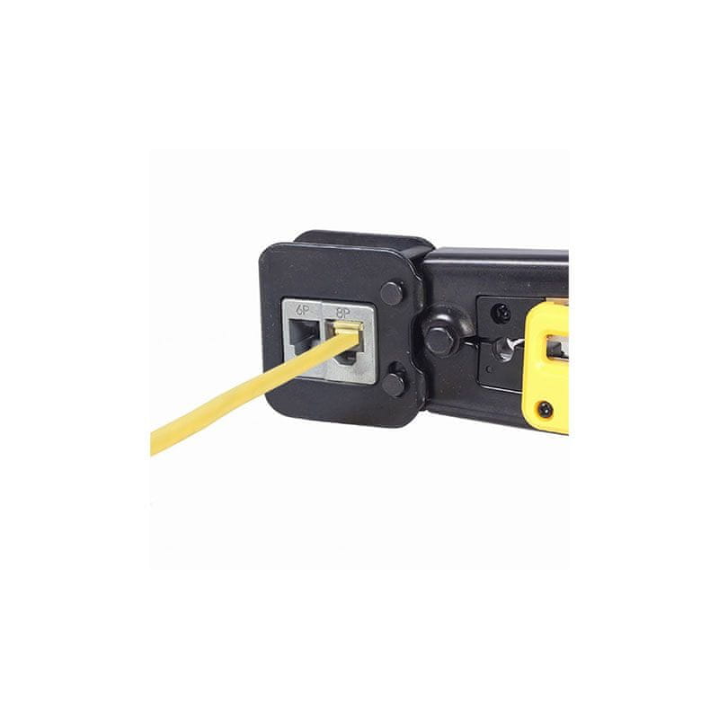 Univerzalni modularni alat za krimpanje s funkcijom rezanja. Pogodan za 8P8C, 6P6C, 6P4C. Ugrađeni rezač i skidanje izolacije za plosnati i okrugli kabel.