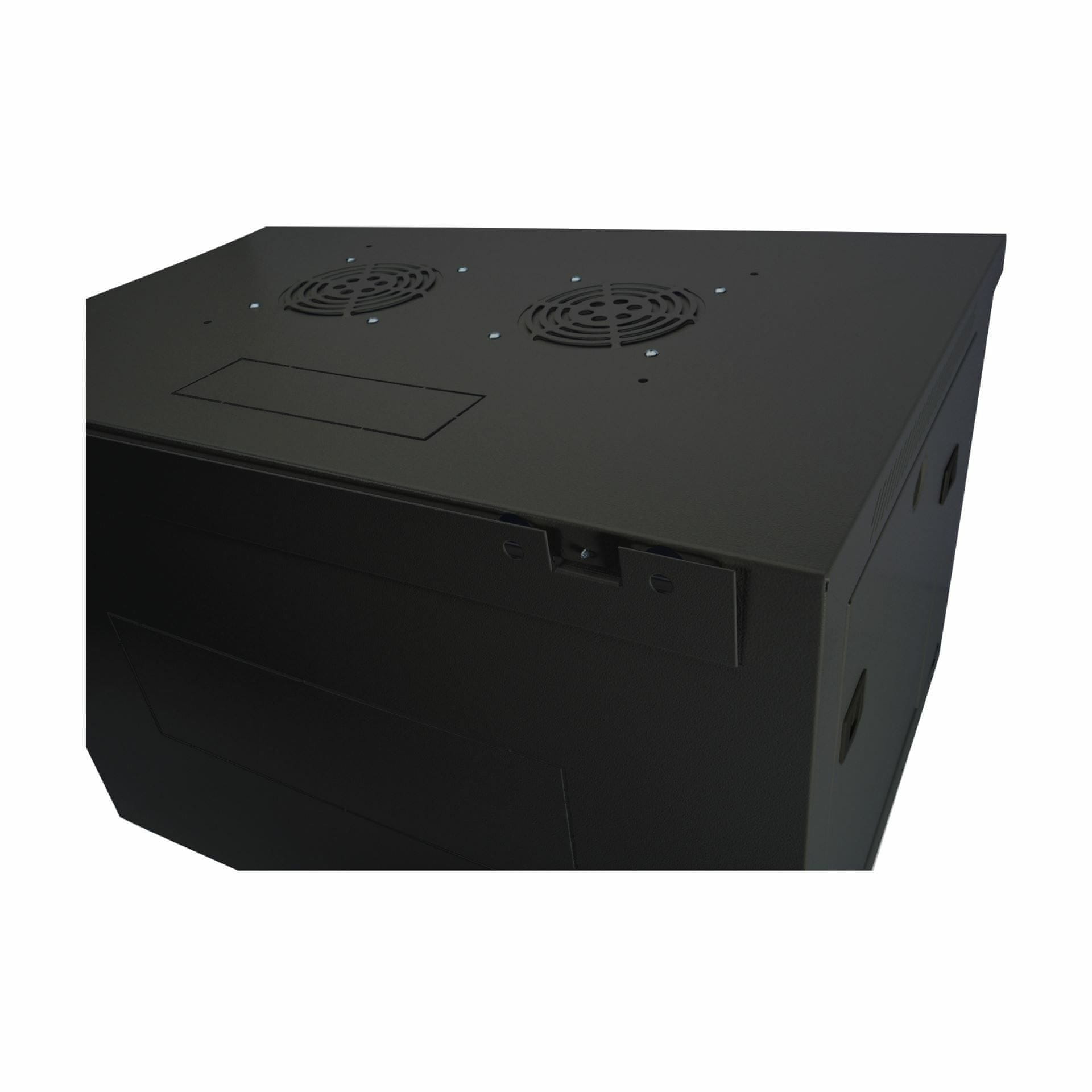 Digitus ormar za zidnu montažu crne boje, dimenzija: visina 7U 416 mm, širina 600 mm i dubina 450 mm, priloženi vijci i matice za pričvršćivanje opreme u ormar. Brava na prednjim vratima, koja se otvaraju za 180 stupnjeva, 2× brzo odvojive stranice…