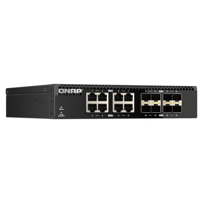 QNAP QSW-3216R-8S8T je unmanaged preklopnik polovične širine za ugradnju u ormar s osam 10GbE SFP+ optičkih vrata i osam 10GbE RJ45 vrata.