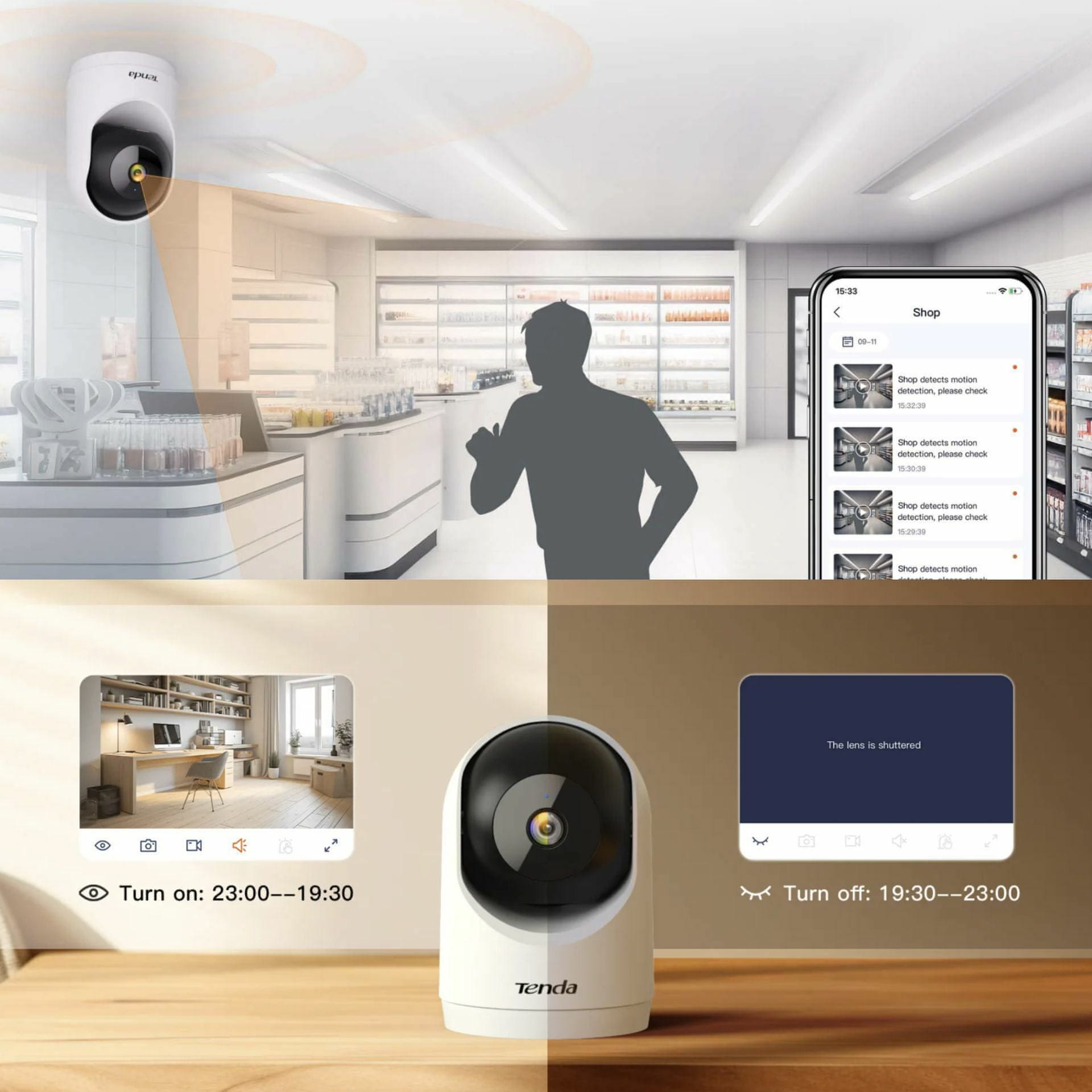 Tenda IP kamera 3.0MP bežična PT RP3 omogućava 360° panoramsko pokrivanje, 3MP HD razlučivost, dvosmjerni audio te praćenje pokreta. Podržava 0–355° pan i –15–55° tilt te detekciju ljudi s obavijestima u stvarnom vremenu. Jednostavna za korištenje i pogodna je za nadzor domova, trgovina, ureda i učionica.