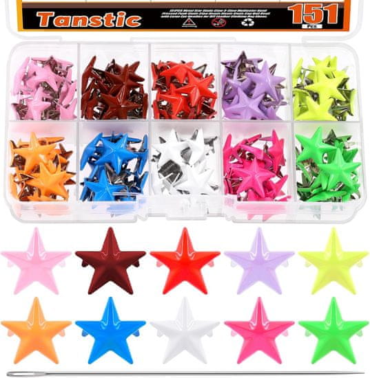 Set od 151 metalne zakovice u obliku zvjezdica predstavlja praktično rješenje za sve koji žele svojim projektima dati jedinstven karakter i prepoznatljiv punk stil. Ovaj komplet sadrži 150 komada šarenih elemenata promjera 15 mm uz dodatak funkcionalne igle s velikim okom koja znatno olakšava proces izrade rupa u koži i raznim tkaninama. Cijeli set dolazi zapakiran u prozirnu plastičnu kutiju koja osigurava uredno skladištenje i jednostavan transport svih dijelova. Zakovice su izrađene od metala s galvanskim premazom, što jamči postojanost i dugotrajnu uporabu u različitim uvjetima. Zahvaljujući širokom rasponu boja, korisnici mogu kreirati vlastite kompozicije i prilagoditi svaki detalj specifičnim zahtjevima svog dizajna, bilo da se radi o osvježavanju starih komada odjeće ili izradi potpuno novih modnih dodataka.