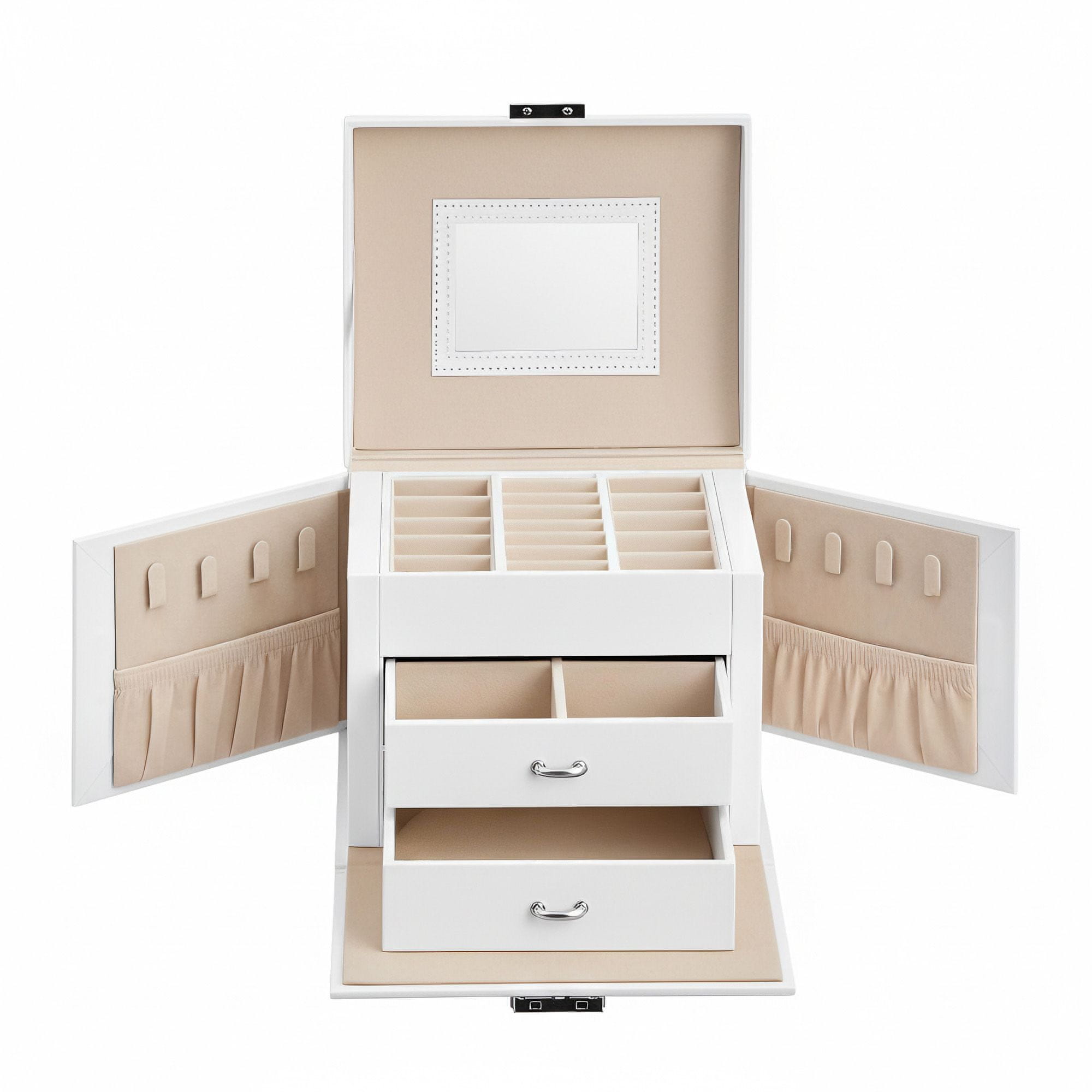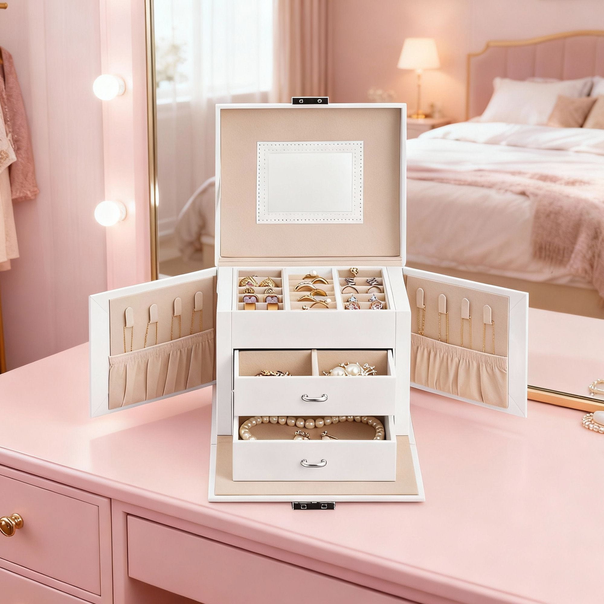 Organizirajte i zaštitite svoj nakit s ovom modernom troetažnom kutijom za nakit s više pretinaca, ugrađenim ogledalom i sigurnosnom bravom. Idealan za putovanja ili kućnu upotrebu, predstavlja moderan i praktičan poklon za vaše najmilije.