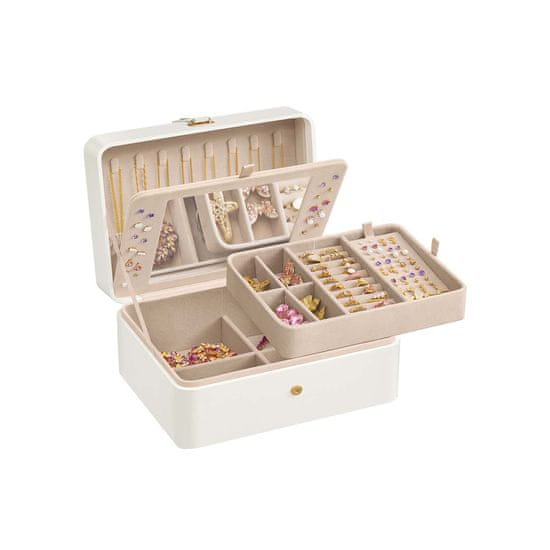 Ova kutija za nakit sa zrcalom nudi organizirani prostor za pohranu vaših dodataka kod kuće ili u pokretu. Njezin dvoetažni dizajn i fleksibilni pladanj pomažu u urednom rasporedu naušnica, prstenja i ostalog. Idealno kao promišljen poklon za ljubitelje nakita.