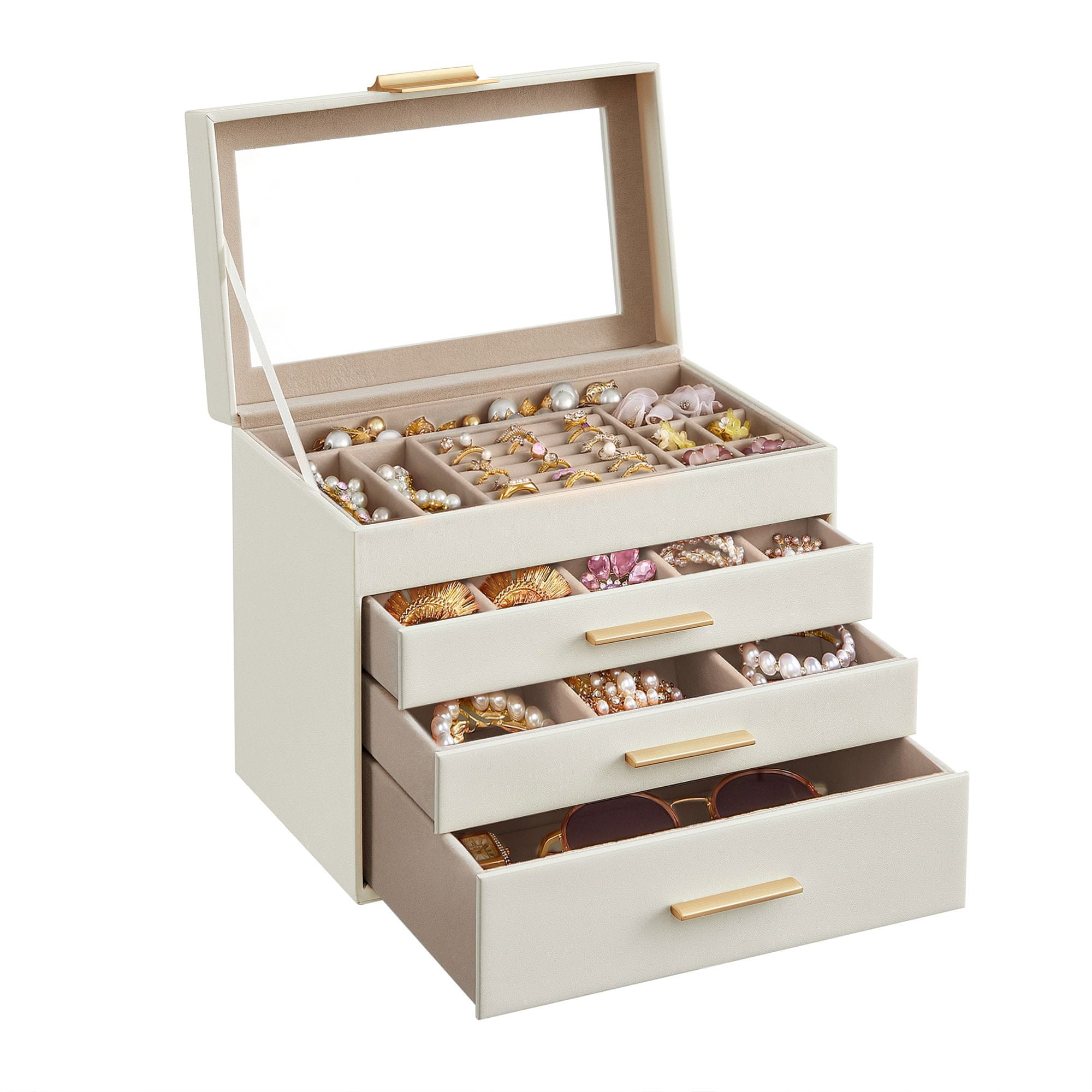 Držite svoj nakit organiziranim i bez prašine s ovom modernom višeslojnom kutijom za nakit s prozirnim staklenim poklopcem. Savršena za pohranu svega, od malih dodataka do većih predmeta poput sunčanih naočala i satova. Idealna za dodavanje modernog izgleda vašoj komodi ili ormaru.