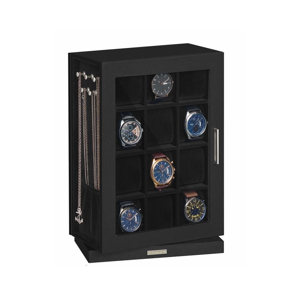 Ova elegantna kutija za satove nudi organizirano spremište za satove, nakit i dodatke. Njezin rotirajući dizajn i stakleni prozor omogućuju jednostavan pristup i stilski prikaz, što je čini idealnom za sigurno i uredno čuvanje vaših vrijednosti.