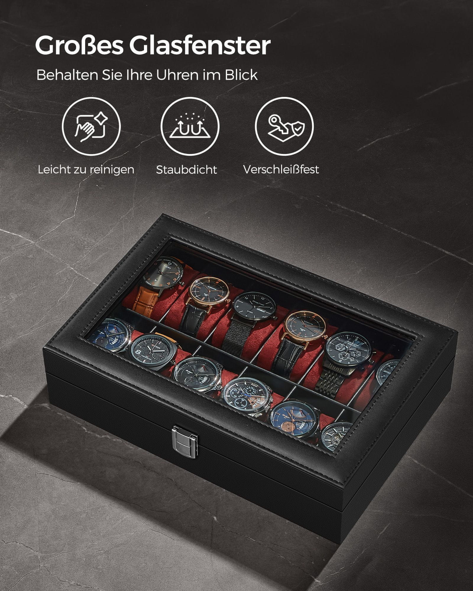 Ova elegantna kutija za satove nudi organizirano spremište za vašu kolekciju satova s pojedinačnim pretincima i prozirnim poklopcem za jednostavan prikaz. Idealna za zaštitu satova od prašine i ogrebotina, čini promišljen poklon za ljubitelje satova.