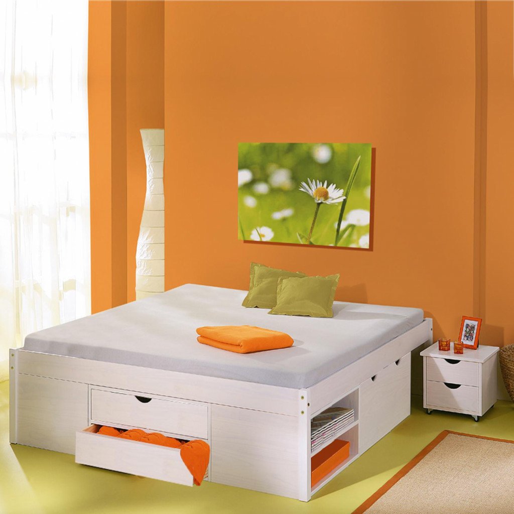 materijal: masivni bor, boja: bijeli lak praktični prostori za pohranu ispod kreveta, visina sjedala: 44,5 cm 2 izvlačna noćna ormarića i letvičasta podnica (drvena letvica) su uključeni, madrac nije uključen preporučena veličina madraca: 180 × 200 cm ili 2 komada 90 × 200 cm ID20900180 do