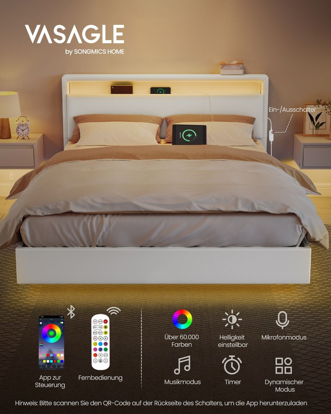 Ovaj moderan okvir za bračni krevet s dvostrukim madracem ima efekt lebdenja, integriranu LED rasvjetu, visok naslon za glavu i praktičnu stanicu za punjenje. Idealno za dodavanje stila i funkcionalnosti vašoj spavaćoj sobi. Madrac nije uključen.