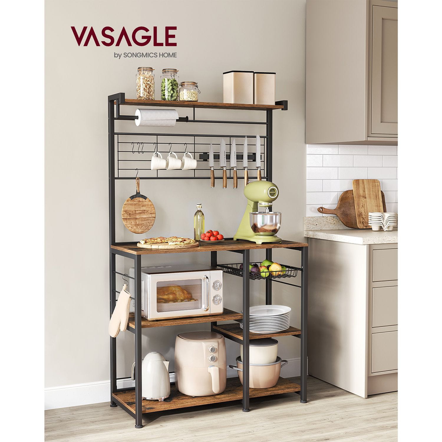 Ovaj svestrani kuhinjski regal dizajniran je za pružanje obilnog prostora za pohranu i organizaciju vaših kuhinjskih potrepština. Sadrži više polica žičanu košaru magnetsku traku za noževe i kukice idealan je za održavanje radnog prostora urednim i učinkovitim. Čvrsta konstrukcija i praktičan raspored čine ga pogodnim za upotrebu kao produžetak kuhinjskog otoka radne ploče ili stalak za pohranu.