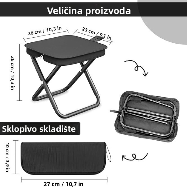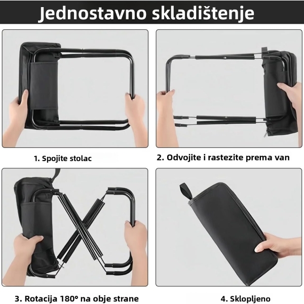 🪑 PORTACHAIR – Udobnost gdje god krenuli! Čvrsta čelična konstrukcija i vodootporna Oxford tkanina drže do 100 kg. Lagani i kompaktni, stane u ruksak (26×24×28 cm sklopljen: 28×12 cm). Idealno za kampiranje, ribolov, koncerte ili planinarenje. Brzo se sklapa i jednostavno čisti.