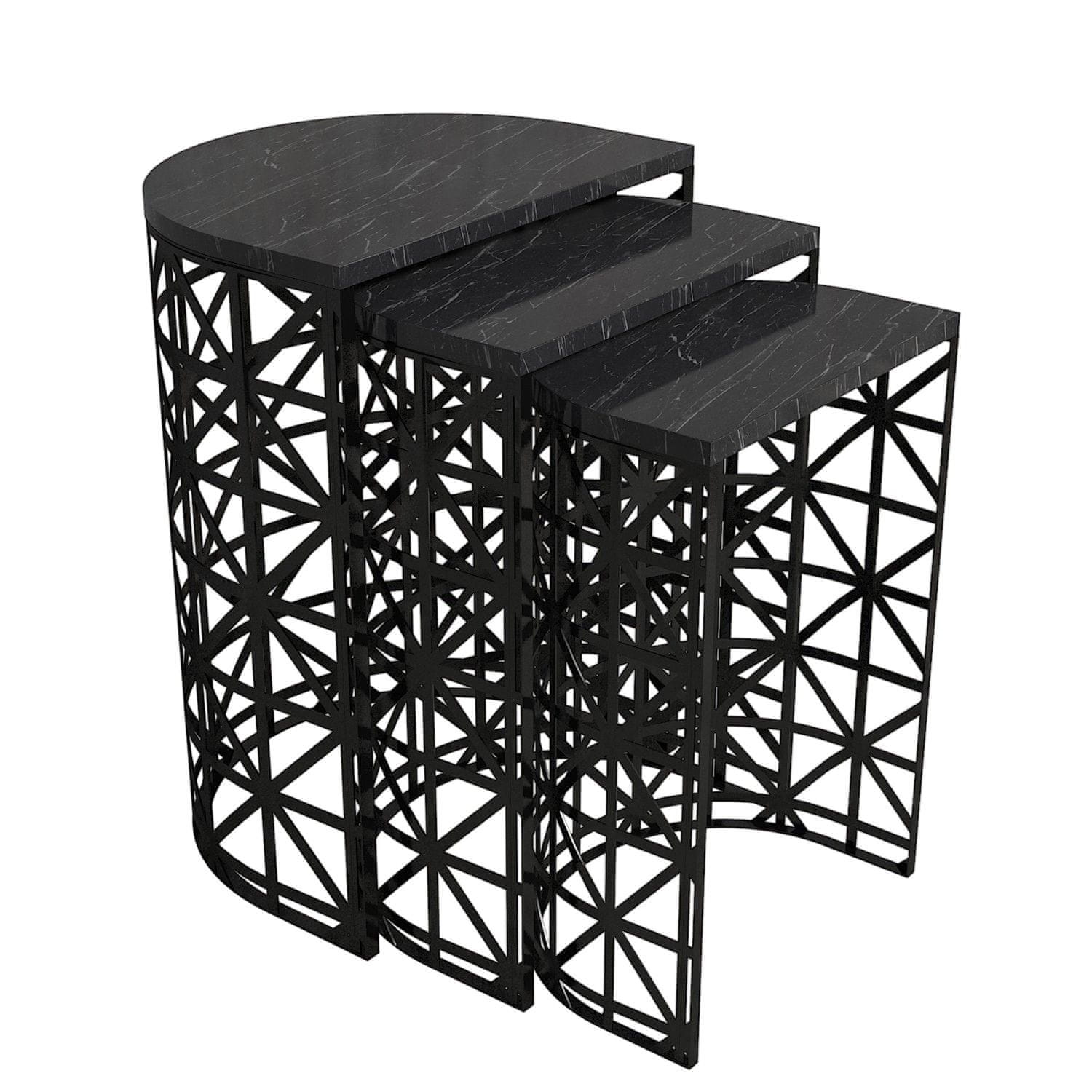 100% iverica obložena melaminskom smolom Debljina: 18 mm Okvir: 100% metal Veći stolić: Širina: 46 cm Visina: 62 cm dubina: 33 cm (1 komad) Srednji stolić: Širina: 41 cm Visina: 58 cm dubina: 30 cm (1 komad) Manji stolić: Širina: 36 cm Visina: 53 cm Dubina: 27 cm (1 komad), Broj paketa: 1