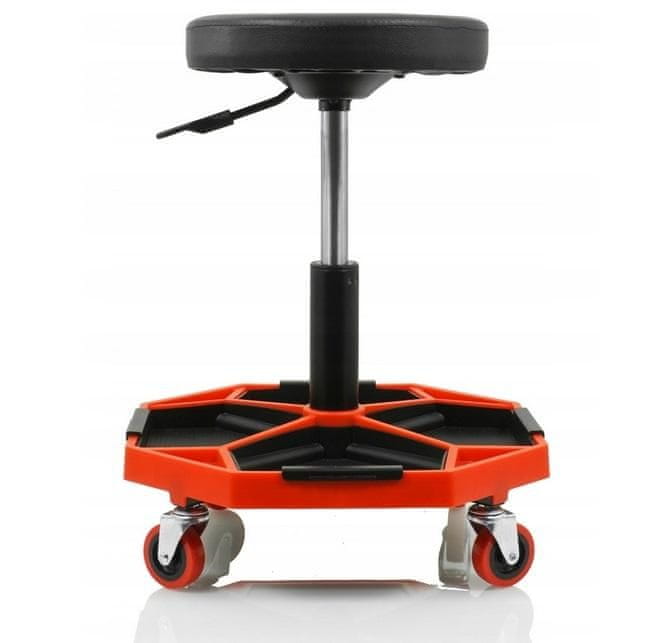 Verke stolica za radionice je dizajnirana za korištenje u profesionalnim radionicama, automehaničarskim radionicama, garažama, a bit će izvrsna i za kućnu garažu. Ima okretno sjedalo i 4 okretna kotača koji povećavaju njegovu mobilnost. Praktično rješenje je opremiti ga velikom policom na koju mehaničar može smjestiti alate koje koristi tijekom rada. Udobna presvlaka sjedala izrađena je od PVC-a. Zahvaljujući pneumatskom podešavanju visine lako se prilagođava visini osobe.