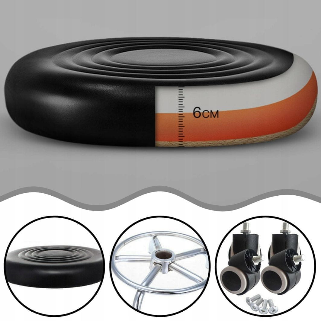 - SPECIFIKACIJA – boja sjedala: crna; materijal: PU – eko koža; max. nosivost: 150 kg; visina sjedala: 5 cm; promjer sjedala: 32 cm; promjer potpornog kotača za noge: 38 cm; podešavanje visine: 44–59 cm; širina baze: 40 cm; težina: 2,77 kg