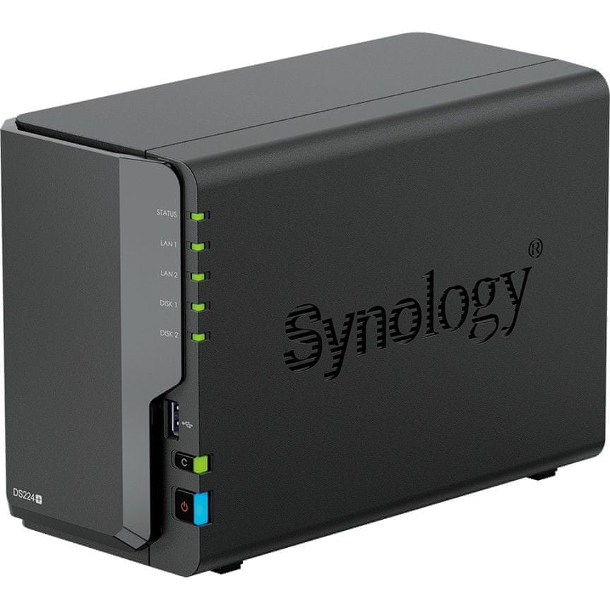 Synology DiskStation DS224+. Podprte vrste pogonov za shranjevanje: HDD in SSD, Vmesnik pogona za shranjevanje: Serial ATA, Velikost pogona za shranjevanje: 2,5/3,5". Družina procesorjev: Intel® Celeron®, Proizvajalec procesorja: Intel, Model procesorja: J4125. Notranji pomnilnik: 2 GB, Notranji Vrsta pomnilnika: DDR4, Največja podprta količina RAM-a: 6 GB Podprti omrežni protokoli: SMB1 (CIFS), SMB2, SMB3, NFSv3, NFSv4, NFSv4.1, NFS Kerberized sessions, iSCSI, HTTP, HTTPs, FTP,… Ohišje tip: Namizni, Vrsta hlajenja: Aktivno, Barva izdelka: Črna