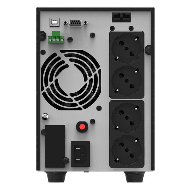 Za dodatnu sigurnost i kontrolu, UPS je opremljen funkcijom EPO (Emergency Power Off), koja omogućuje trenutačno isključivanje u hitnim slučajevima, i ROO (Remote On/Off) funkcijom, koja omogućuje daljinsko upravljanje. LCD zaslon s automatskim zatamnjivanjem, aktiviran jednim klikom, omogućuje jednostavno praćenje rada i potrošnje energije.
