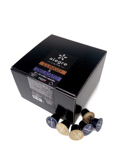 Alegre Caffe Lungo i Delicato kapsule su primjerene za aparate za kavu Nespresso. U pakiranju je 50 komada Lungo kapsula kave i 50 komada Delicato kapsula kave.