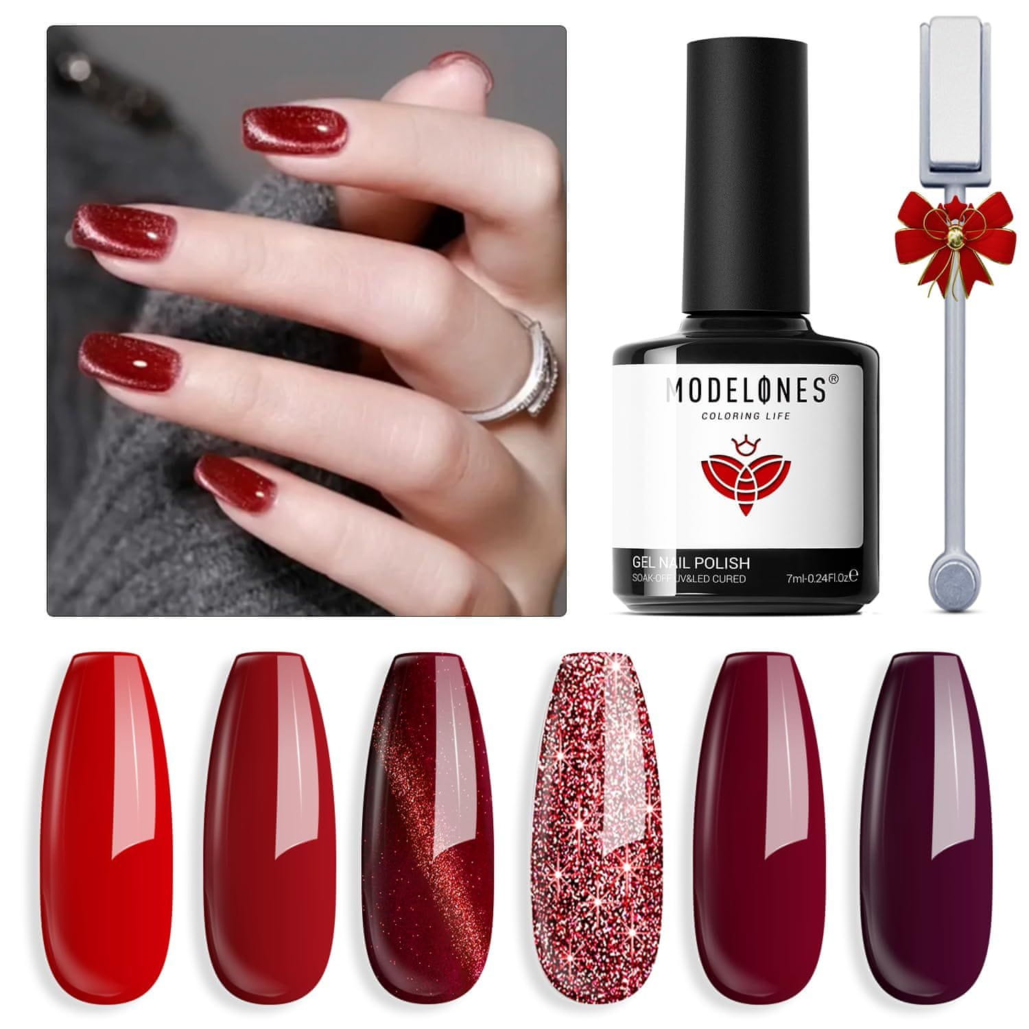 slomart modelones UV lak za nokte crveni, 6 boja Cat Eye crveni svjetlucavi bordo tamni gel lak za nokte s magnetom, set gel lakova set gel noktiju Soak Off manikura Nail Art Salon DIY