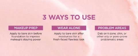 - ŠMINKA PRIMER ZA LICE I PODRUČJE ISPOD OČIJU: Nanesite na golu kožu ili nakon što se hidratantna krema potpuno upije. Umasirajte na područje ispod očiju kako bi zagladili sitne bore, na područje nosa i obraza kako bi smanjili pojavu pora i mrljica te na područje t-zone za mat izgled