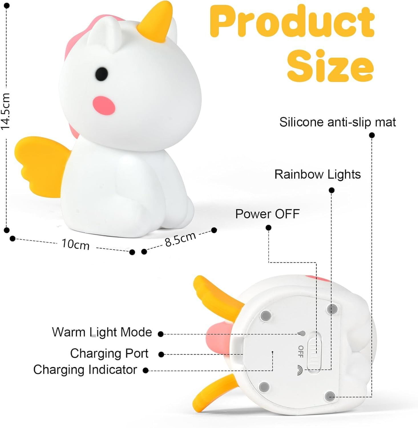 Mala noćna svjetiljka u obliku šarmantnog jednoroga idealan je pratitelj za spavanje za djecu i odrasle koji cijene ugodnu atmosferu i kreativan dizajn. Opremljena s 3 razine podešavanja svjetline toplog svjetla i 7 duginih boja, omogućuje prilagodbu osvjetljenja raspoloženju i potrebama korisnika. Promjena boje je intuitivna – dovoljno je nježno dodirnuti svjetiljku ili je pomaknuti rukom kako bi se postigla efektna iluminacija.
