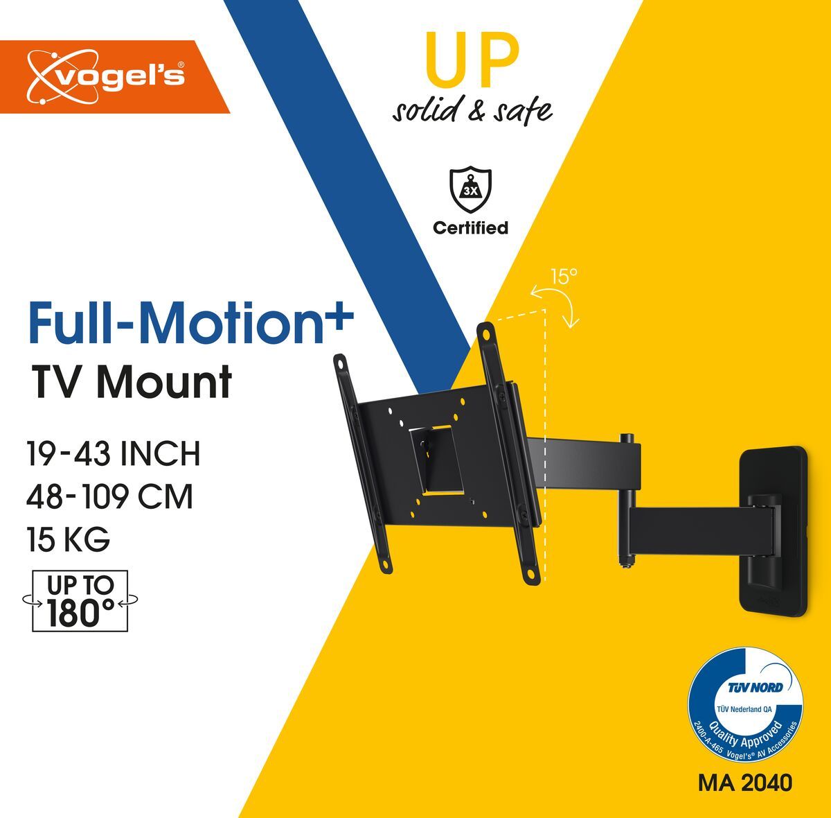 Vogel's MA 2040 full-motion nosač za TV do 43" i 15 kg omogućuje punu rotaciju do 180° i nagib do 15° za idealan kut gledanja iz bilo kojeg dijela prostorije. Čvrst, siguran i TÜV certificiran, uz jednostavnu montažu i pouzdanu UP kvalitetu. Cijeli opis