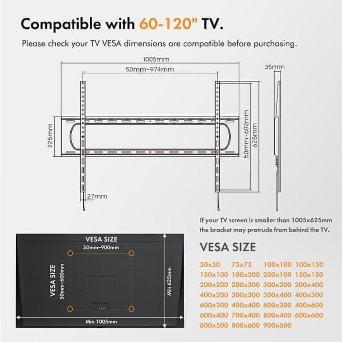 VonHaus TV nosač za zid, kompatibilan s TV-ima od 60–120". Nosivost do 120 kg. Čelična konstrukcija s crnim premazom. Montira se blizu zida. VESA standardi: 200×200 do 900×600. Udaljenost od zida: 35 mm. Cijeli opis