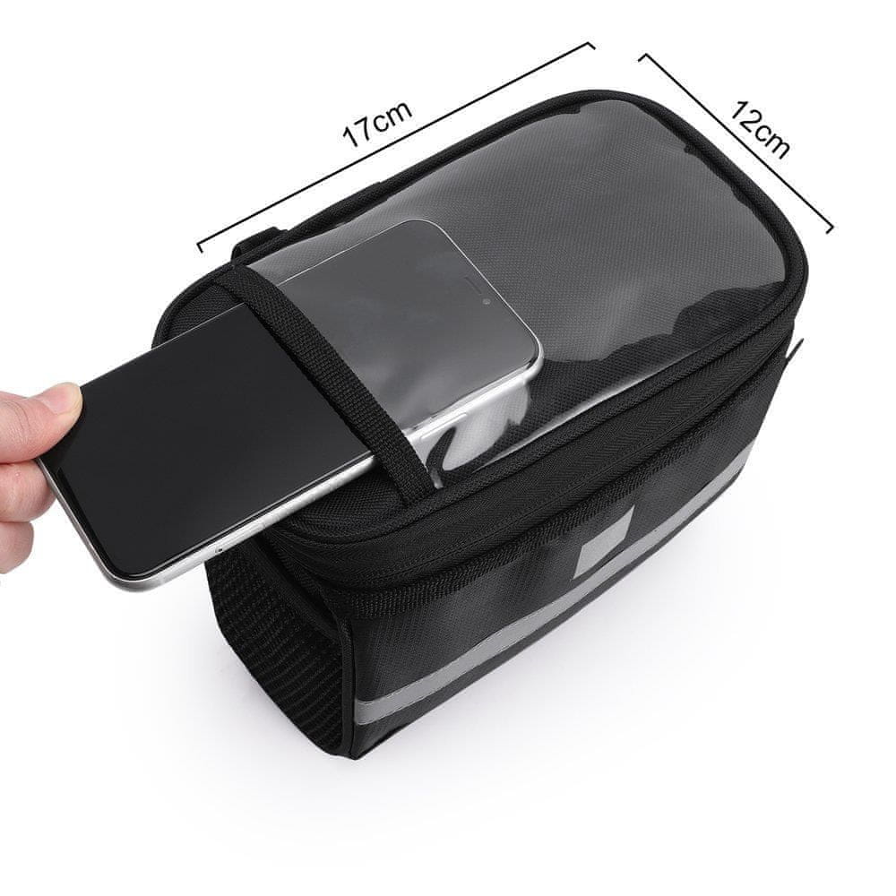 Torba za bicikl – postavljanje na upravljač bicikla, kopčanje patentnim zatvaračem. Pogodno za odlaganje telefona, novčanika, ključeva i drugih sitnica.