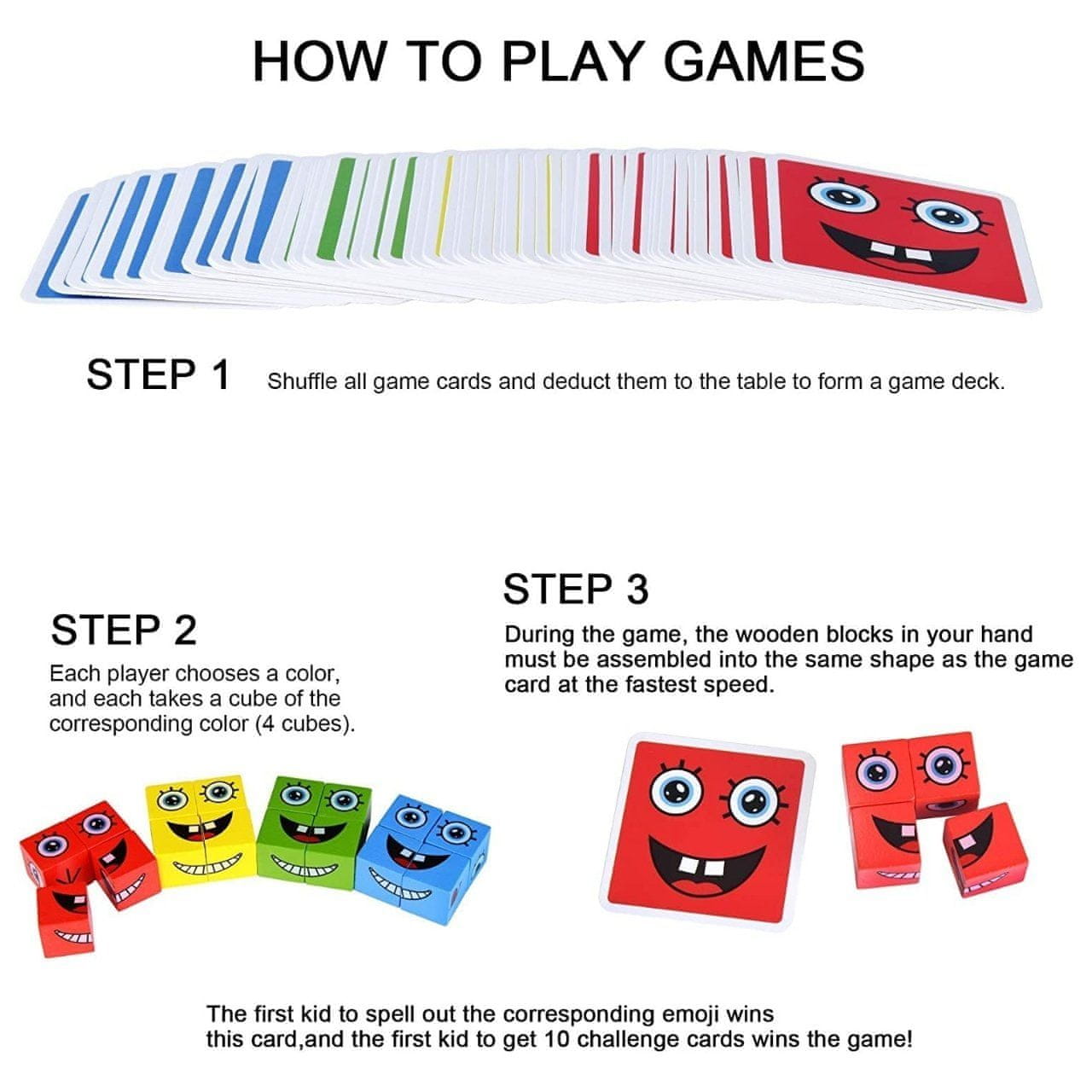 Dijete odabire karticu s izrazom lica i uz pomoć drvenih kocki slaže isti izraz. Igra potiče razgovor o osjećajima, razvija empatiju i sposobnost zapažanja. Preporučuje se za zajedničku igru djece i odraslih.