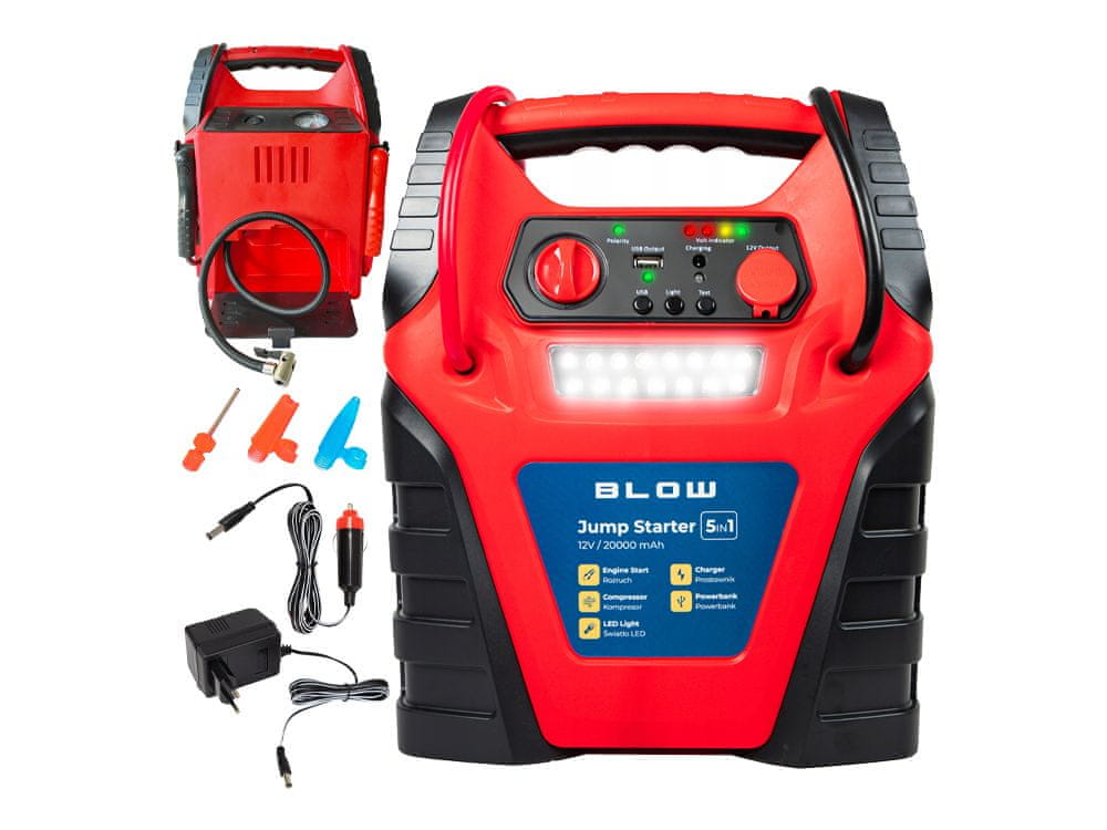 BLOW starter je dizajniran kao kompaktan, izdržljiv i prenosiv sustav za pokretanje vozila. Ova jedinica će pokrenuti sve vrste vozila i baterija, a također se može koristiti kao prijenosni DC 12V izvor napajanja u hitnim situacijama. Ima ugrađene jednostavne LED indikatore statusa rada, a dodatno ima ugrađenu 12V utičnicu i priložen adapter za auto upaljač. Baterija se također može puniti s priloženim napajanjem od 220 V.