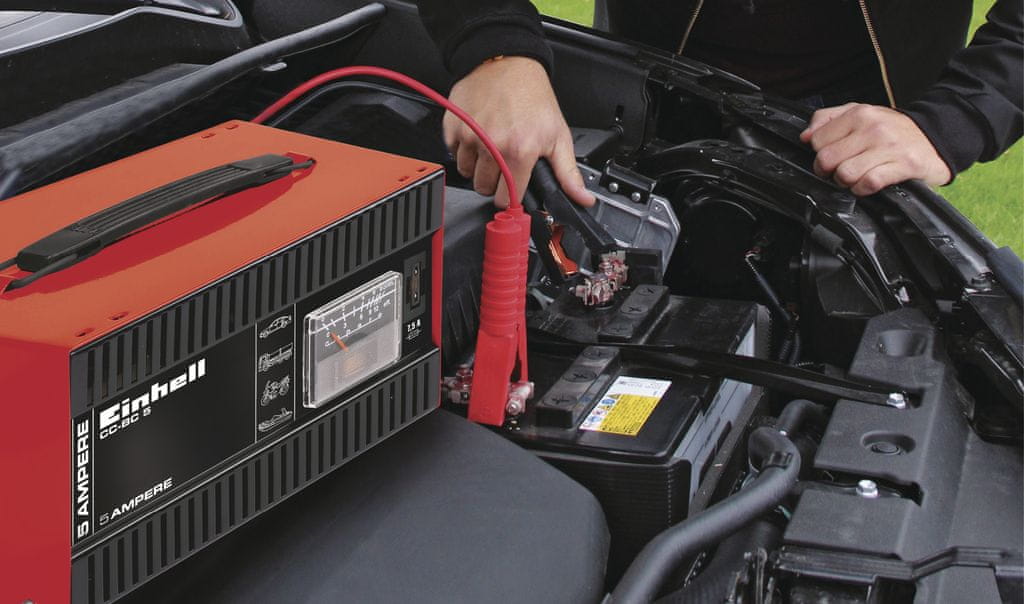 12V punjač za akumulator BC-CC 5Punjač radi na naponu od 12 V i namijenjen je za punjenje baterija u automobilima i motorima. Ugrađeni ampermetar prikazuje strujni tok. Robusno kućište s izolacijom osigurava maksimalnu sigurnost i štiti od prenapona, kratkog spoja i promjene polariteta. Uređaj ima snažne, potpuno izolirane priključke koji nude optimalan kontakt s terminalima akumulatora. Robusna ručka omogućuje jednostavno i brzo prenošenje uređaja. Opseg isporuke: