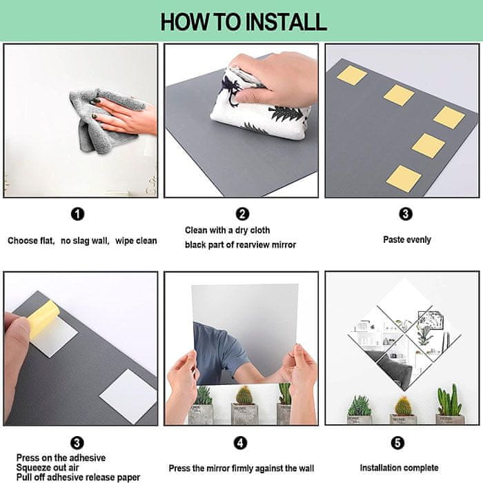Prije postavljanja, osigurajte da je površina čista, suha i ravna. Zalijepite pomoću priloženih listića. Nije namijenjeno za korištenje kao zamjena za pravo stakleno ogledalo u funkcionalne svrhe (npr. brijanje).
