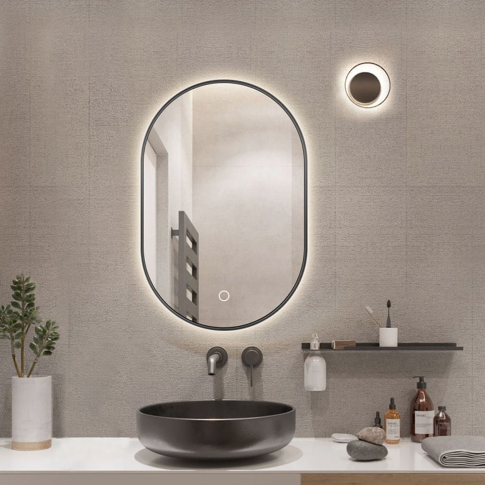 LED ogledalo S611B izuzetno je elegantnog izgleda i šarmantnog dizajna, sa crnim okvirom koji potpuno oživljava kupaonicu. Ogledalo ima ambijentalno osvjetljenje, odnosno LED svjetlo osvjetljava zid na koji je postavljeno LED ogledalo.. Ogledalo ima funkciju paljenja i gašenja LED rasvjete, s prekidačem na dodir također je moguće podesiti tri tona LED svjetla, od hladno bijele do tople bijele, te intenzitet svjetla – Dimmer. Ogledalo ima i funkciju grijanja koja sprječava zamagljivanje ogledala. . Na stražnjoj strani ogledala nalaze se dva nosača spremna za montažu na zid, a iz ogledala se izvodi kabel za spajanje na električnu mrežu.