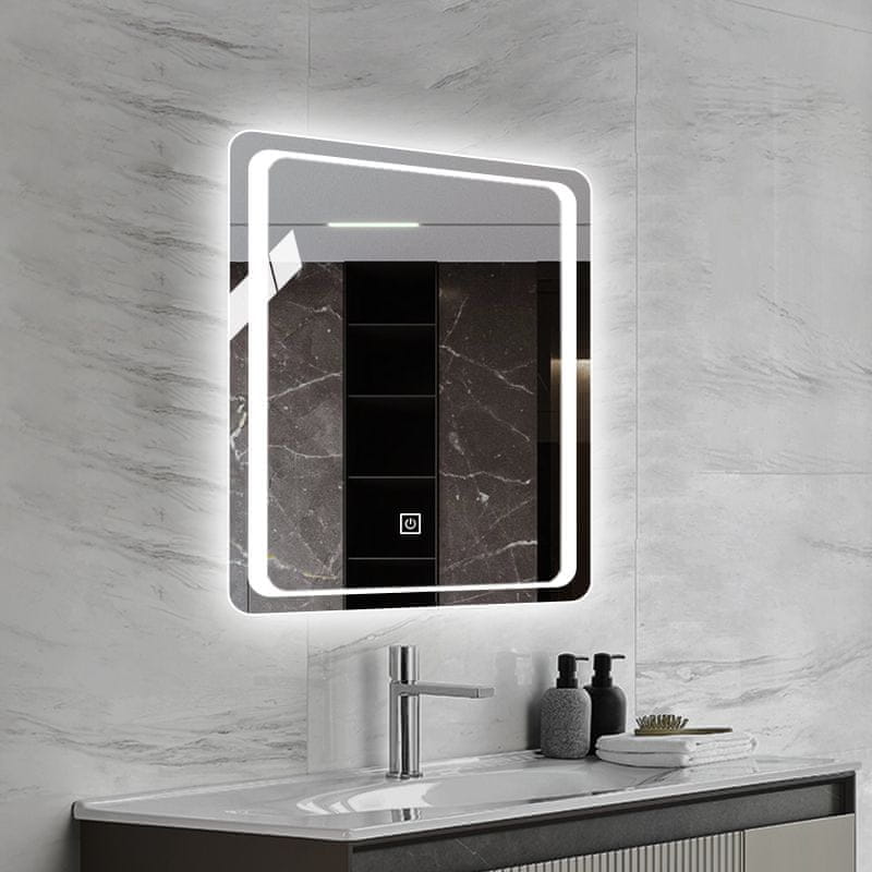LED ogledalo S64B iznimno je elegantnog izgleda i šarmantnog dizajna sa zaobljenim rubovima, koji potpuno oživljava kupaonicu. LED svjetlo prodire kroz zaobljenu mat traku duž ruba ogledala, tako da će kupaonica biti potpuno osvijetljena. LED ogledalo Ogledalo ima funkciju paljenja i gašenja LED rasvjete, s prekidačem na dodir također je moguće podesiti tri tona LED svjetla, od hladno bijele do tople bijele, te intenzitet svjetla – prigušivanje. Ogledalo ima i funkciju grijanja koja sprječava zamagljivanje ogledala. Stražnja strana ogledala je izrađena od aluminija i spremna je za montažu na zid.