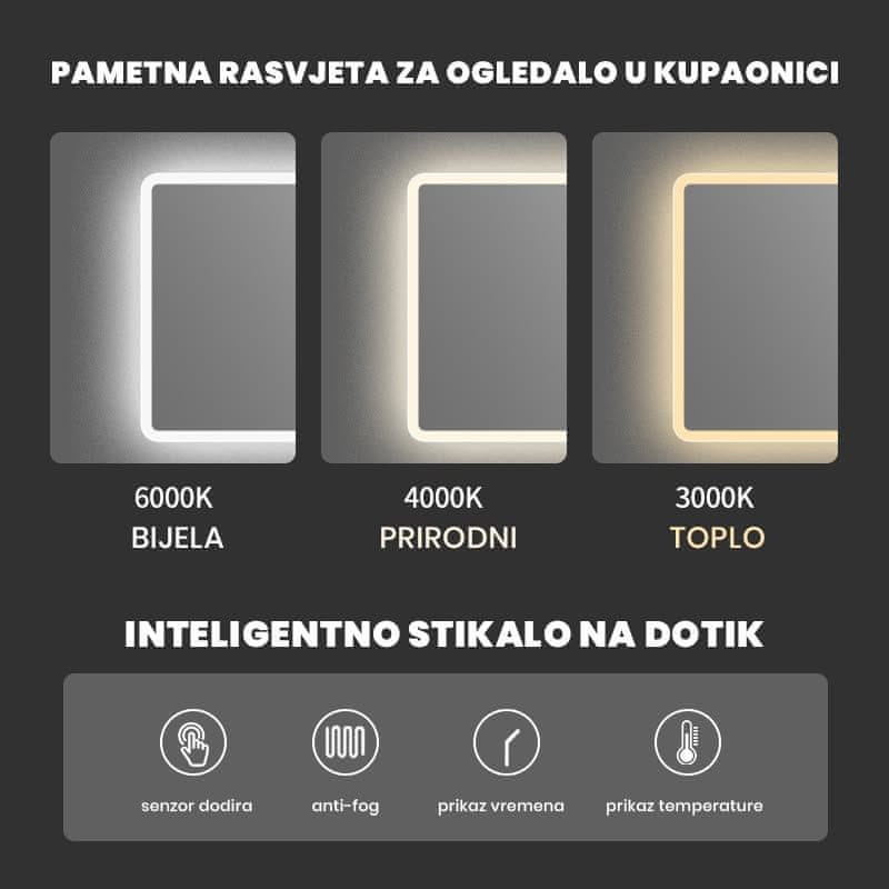 Ogledalo je opremljeno pametnim prekidačem na dodir, putem kojeg možete jednostavno uključiti ili isključiti osvjetljenje, podesiti boju svjetla (hladno bijela, neutralna ili toplo bijela – 6000K, 4000K, 3000K) te prilagoditi intenzitet pomoću dimmer funkcije. Tako u svakom trenutku možete stvoriti savršeno osvjetljenje – od opuštajućeg večernjeg do osvježavajućeg jutarnjeg.