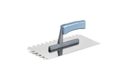gleterica od nehrđajućeg čelika 270 × 130 mm – zubac bukva, lakirana, ergonomska drška nehrđajući čelik, lim otporan na kiseline, debljine 0,7 mm nanošenje ljepila, veličina zubaca proporcionalna. Cijeli opis