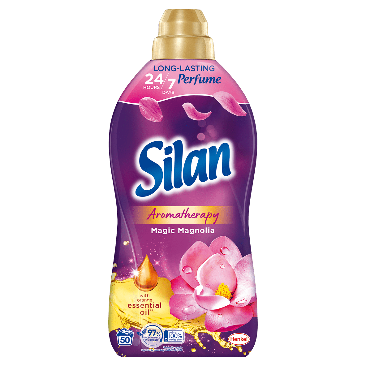 Silan Aromatherapy omekšivač rublja Magic Magnolia, 1,1 l, 50 pranja, obavija rublje ugodnim mirisom koji traje 7 dana, dok dragocjena eterična ulja umiruju vaša osjetila. Dvostruko koncentrirana formula štedi vodu i sadrži 97% biorazgradivih sastojaka. U samostojećoj torbi za koju je potrebno 70% manje plastike.