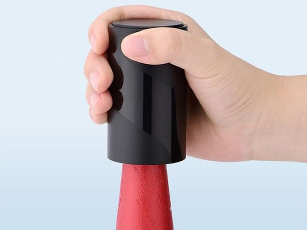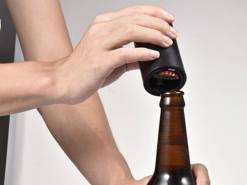 Otvarač je jednostavan i brz za korištenje – samo postavite otvarač okomito na zatvorenu bocu i pritisnite. Otvarač će sam iskočiti s čepom.
