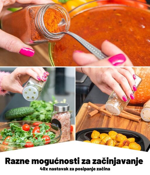 U setu dolaze dvije vrste poklopaca za posipanje (po 24 komada), tako da možete odabrati sustav doziranja koji najbolje odgovara sadržaju svake staklenke. Staklenke se mogu koristiti i bez poklopca za posipanje.