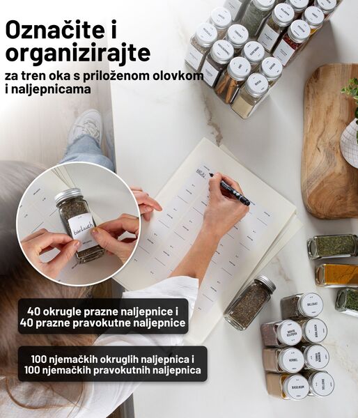 Ne dobivate samo 24 izvrsne staklenke za začine, nego kompletan set sa svime što vam treba. Uključuje 100 predtiskanih okruglih naljepnica s imenima začina na njemačkom, 100 predtiskanih pravokutnih naljepnica, 40 praznih okruglih i 40 praznih pravokutnih naljepnica na koje možete pisati priloženim visokokvalitetnim krednim markerom.
