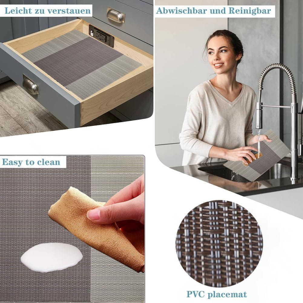 Podmetači za stol Blibalaskr predstavljaju spoj visokokvalitetnih materijala i modernog dizajna. Izrađeni od 70% PVC-a i 30% poliestera, sigurni su i višekratno upotrebljivi, idealno štiteći i ukrašavajući Vaš stol. Bez obzira na prigodu, bilo da je to Božić, Dan očeva, useljenje ili Dan zahvalnosti, ovi podmetači u smeđoj boji dodaju eleganciju svakom interijeru. Podmetači Blibalaskr mogu izdržati temperature do 80℃, što štiti Vaš stol od opeklina vrućim posuđem. Također su vrlo jednostavni za čišćenje – dovoljno ih je isprati vodom ili prebrisati vlažnom krpom. U slučaju mrlja, može se koristiti mekana četkica. Elastičnost materijala omogućuje jednostavno skladištenje – podmetači se mogu slagati ravno, smotati ili presaviti bez brige o zauzimanju puno prostora. Moderni tkani uzorak na podmetačima daje im elegantan izgled koji se uklapa u svaku blagovaonicu, kuhinju, dnevni boravak, pa čak i ured ili hotel. Zahvaljujući otpornosti na toplinu i protukliznim svojstvima, ovi podmetači nisu samo lijepi, već i funkcionalni, štiteći površine od ogrebotina.