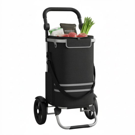 Ovaj sklopivi kolica za kupovinu nudi praktično rješenje za nošenje namirnica i svakodnevnih potrepština. Sadrži uklonjivu torbu i hladnjak koji pomažu u održavanju svježine i organizacije predmeta tijekom kretanja. Reflektori povećavaju sigurnost tijekom upotrebe.