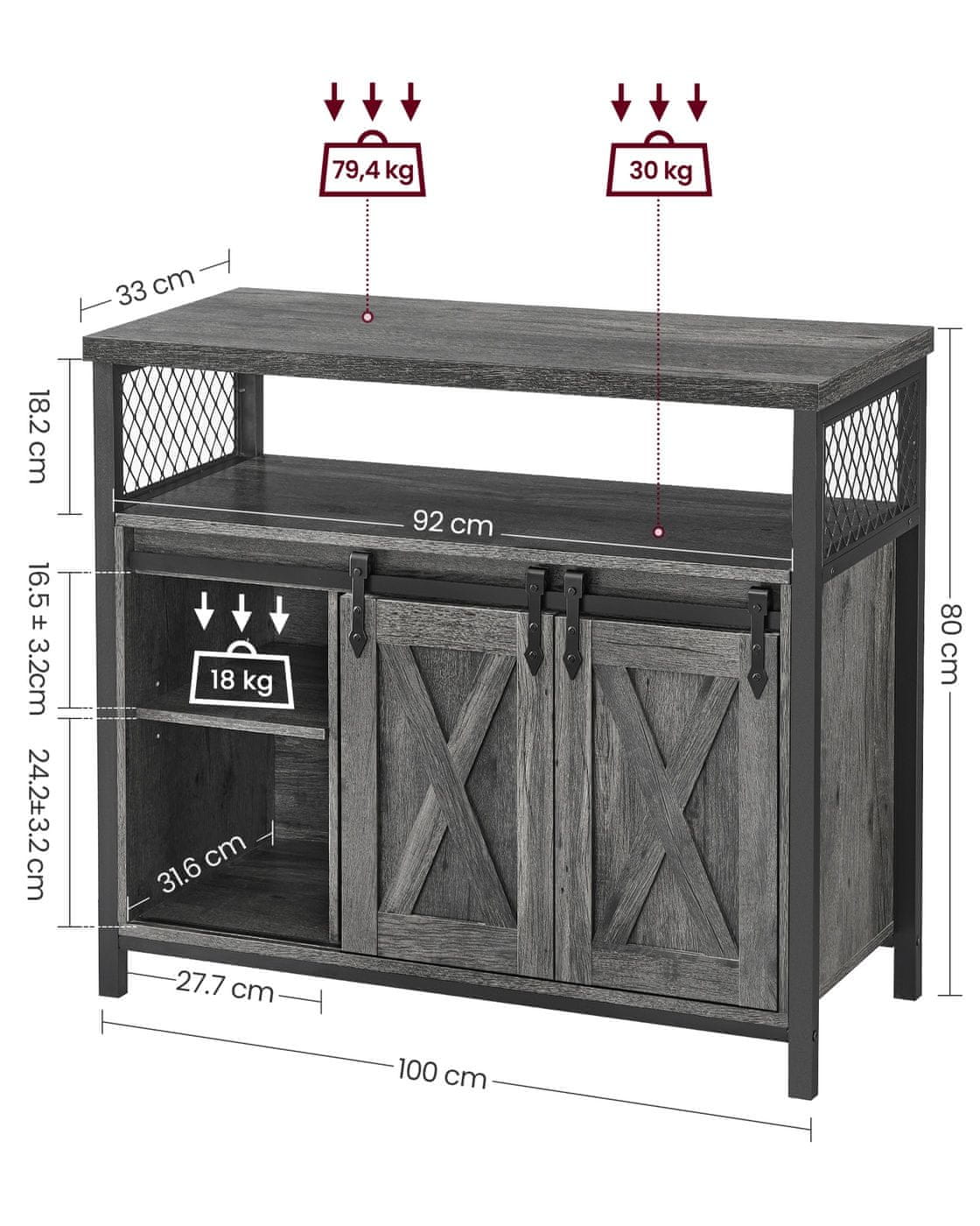- Veličina: 33 × 100 × 80 cm (D x Š x V)