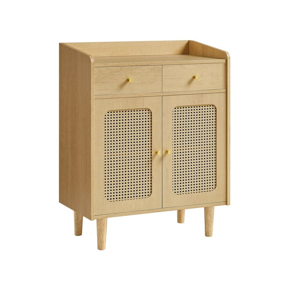 Ovaj boho stil sideboard nudi moderan i funkcionalan prostor za pohranu u vašoj blagovaonici ili kuhinji. Sa vratima u izgledu ratana i podesivom policom pruža dovoljno prostora za organizaciju vaših stvari istovremeno oplemenjujući interijer prirodnim i toplim izgledom. Kombinacija čvrstih materijala osigurava trajnost i stabilnost za svakodnevnu upotrebu.